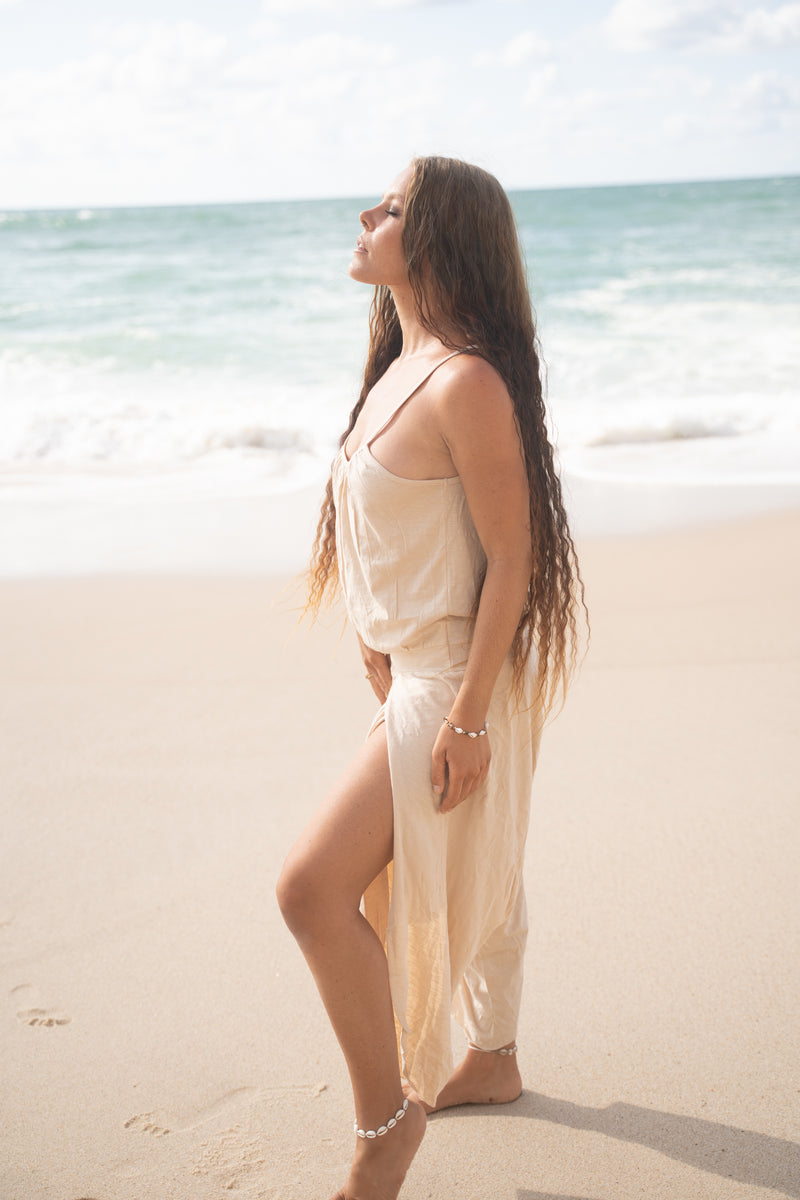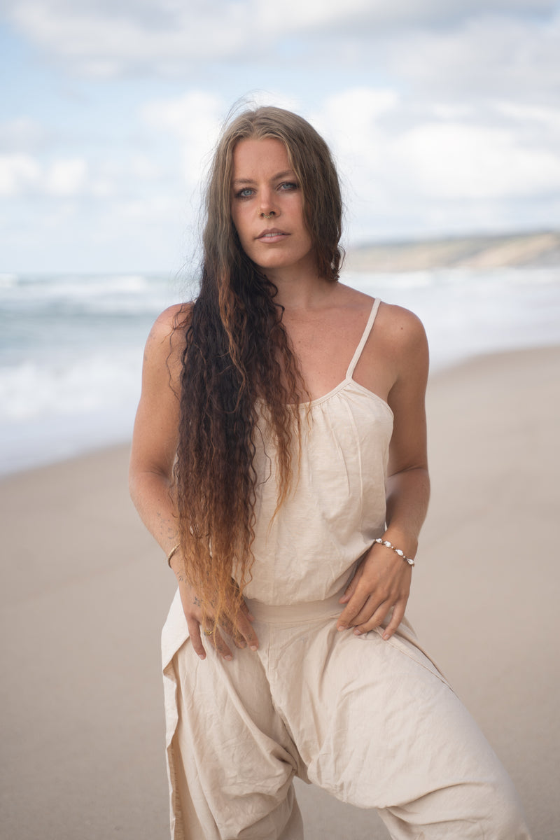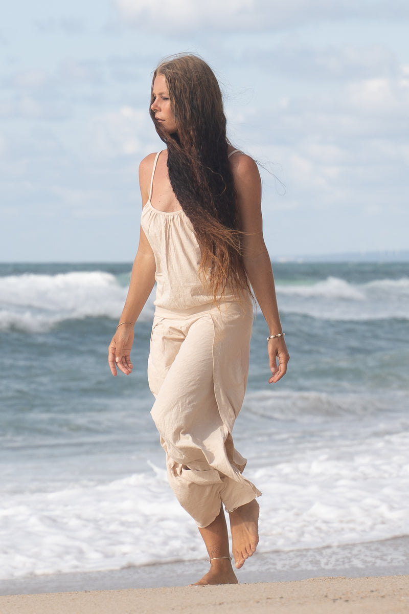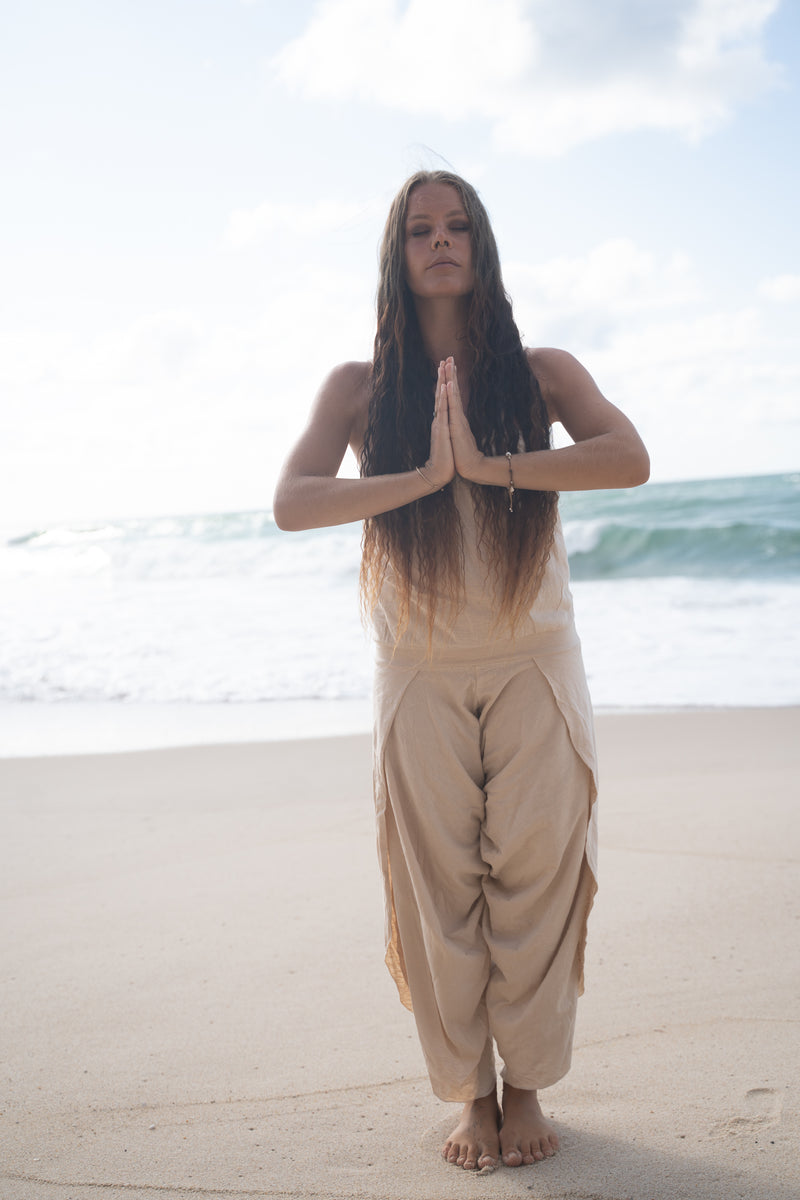 KAYANA بذلة رومبير بشكل عام بيج كريم مصنوع يدويًا قطن طبيعي يوجا مقصوص بأرجل مفتوحة فضفاض مرن يسمح بمرور الهواء مهرجان بوهو الغجر أججايا