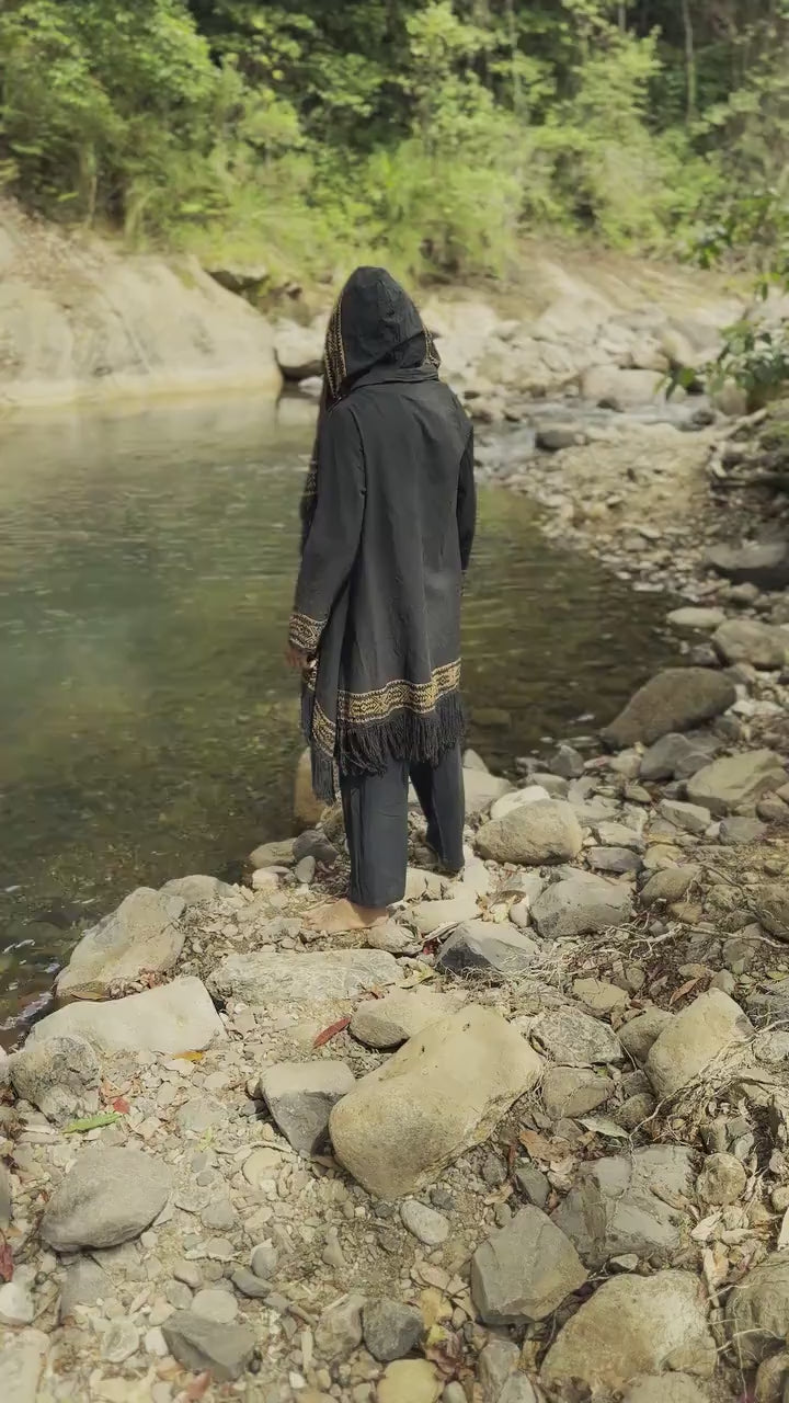 Our JUBBA cloak is a hybridised combination of a jacket, poncho, cloak and robe . . . it has a large hood, long sleeve and a pocket . . . can be worn open or closed with a coconut button on the shoulder . . .
