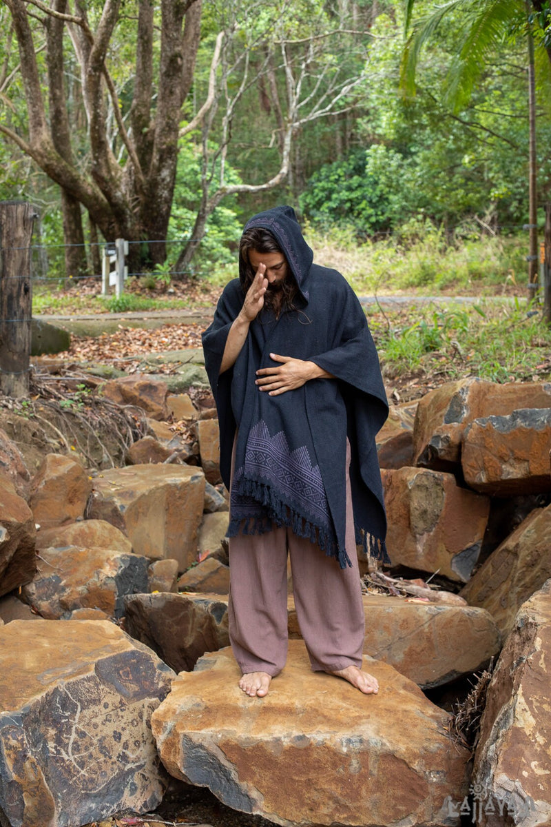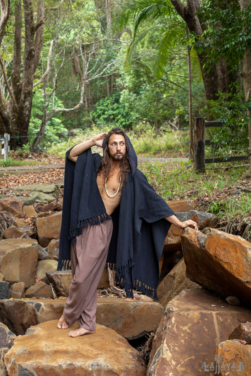 JUBBA Beige Mens Hooded Cloak Long Sleeve Poncho Jacket Festival Tribal Dystopian Apocalyptic Block Printed Steampunk Handmade Dune AJJAYA
