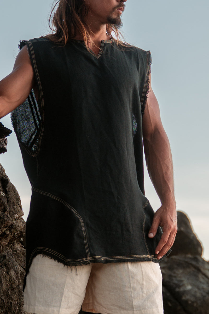 Camiseta sin mangas para hombre hecha a mano Beige Neo Gypsy sin mangas Earthy Top Shirt, Tribal Jungle Natural Savage Neck Festival Rave AJJAYA Nomadic Primitive
