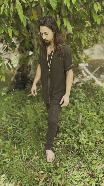 IKRAN Black Mens Cotton T Shirt Top Stone Washed Naturally Dyed Tribal Pattern Open V Neck Breathable Festival Ceremony Ritual Shaman AJJAYA