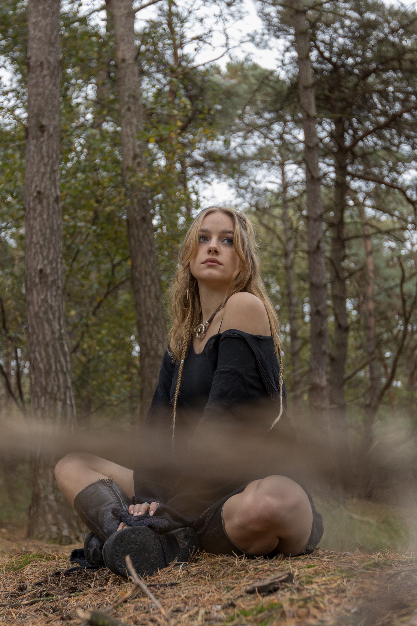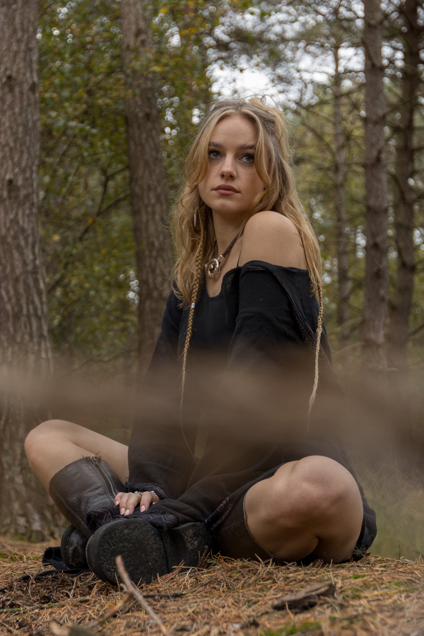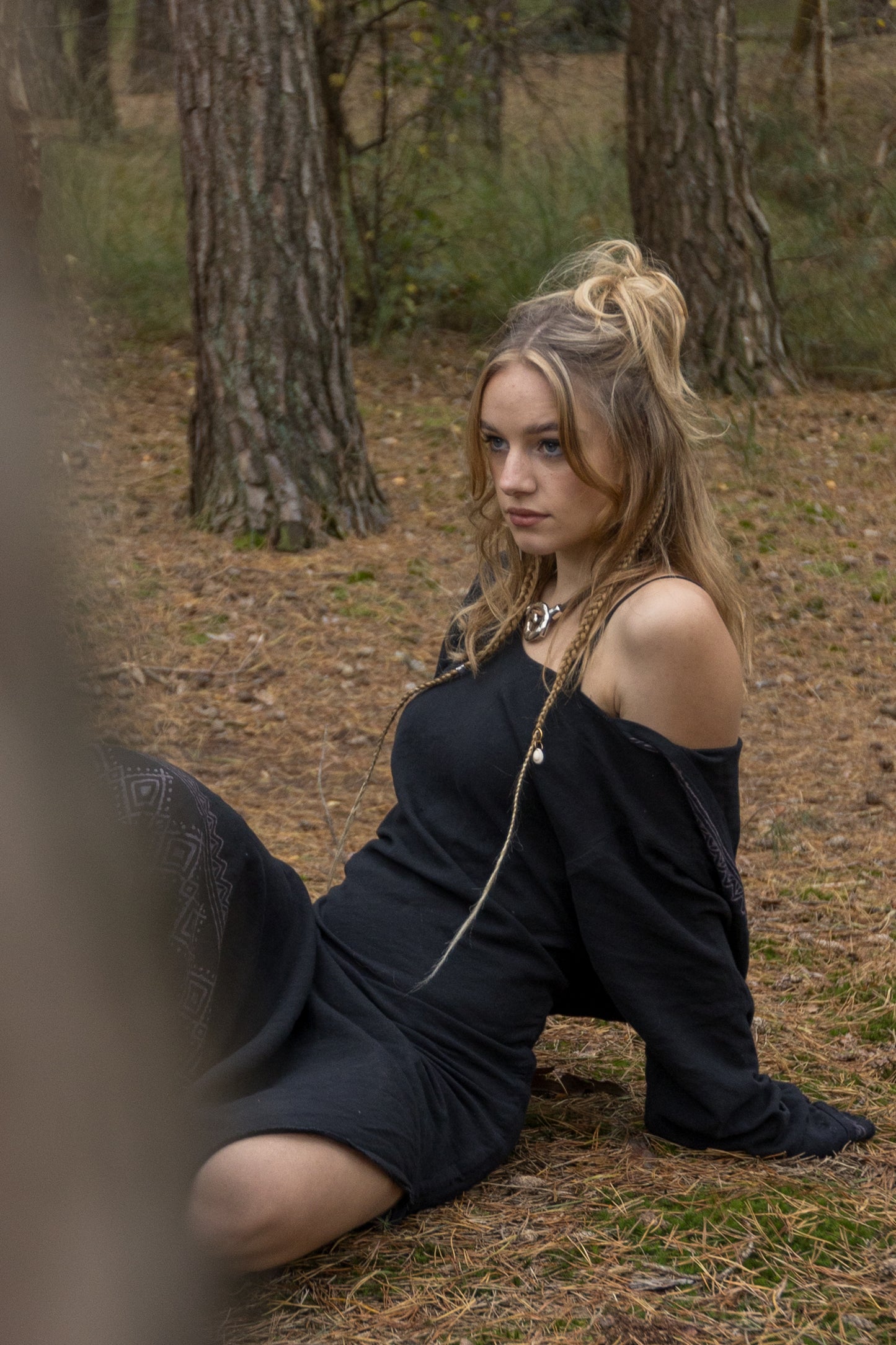 Our MISTIK Ankle Long Dress has long sleeves and an oversized hood . . .