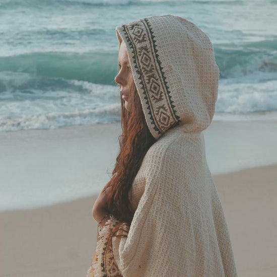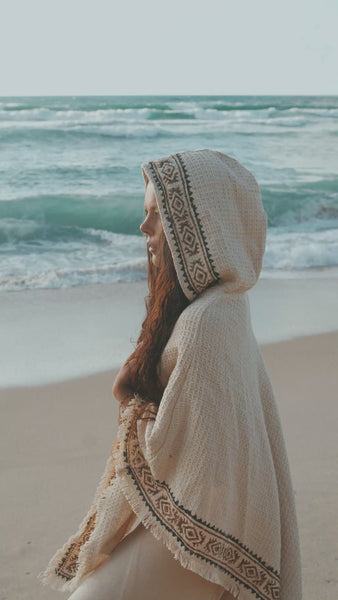 ¡Nuestro poncho VECHO es totalmente vegano! está hecho de algodón natural texturizado y está decorado con estampados en bloques. . .