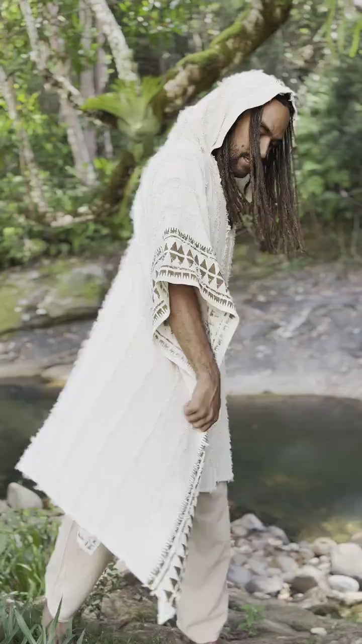 Notre poncho AKKAD est composé à 100 % de coton naturel. Il a une grande capuche et deux poches. Teinté naturellement et orné de motifs tribaux imprimés à la masse, ce poncho deviendra votre compagnon idéal pour les cérémonies, rituels et fêtes. . .