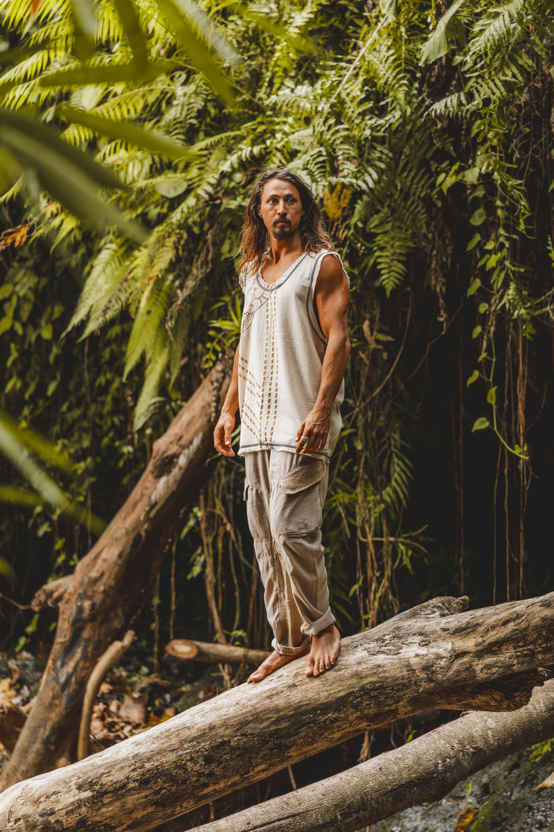 MUKTI Beige Mens Débardeur sans manches Combo Shipibo et Block Print sur coton gypsy festival chemise ethnique éclectique Tribal respirant AJJAYA