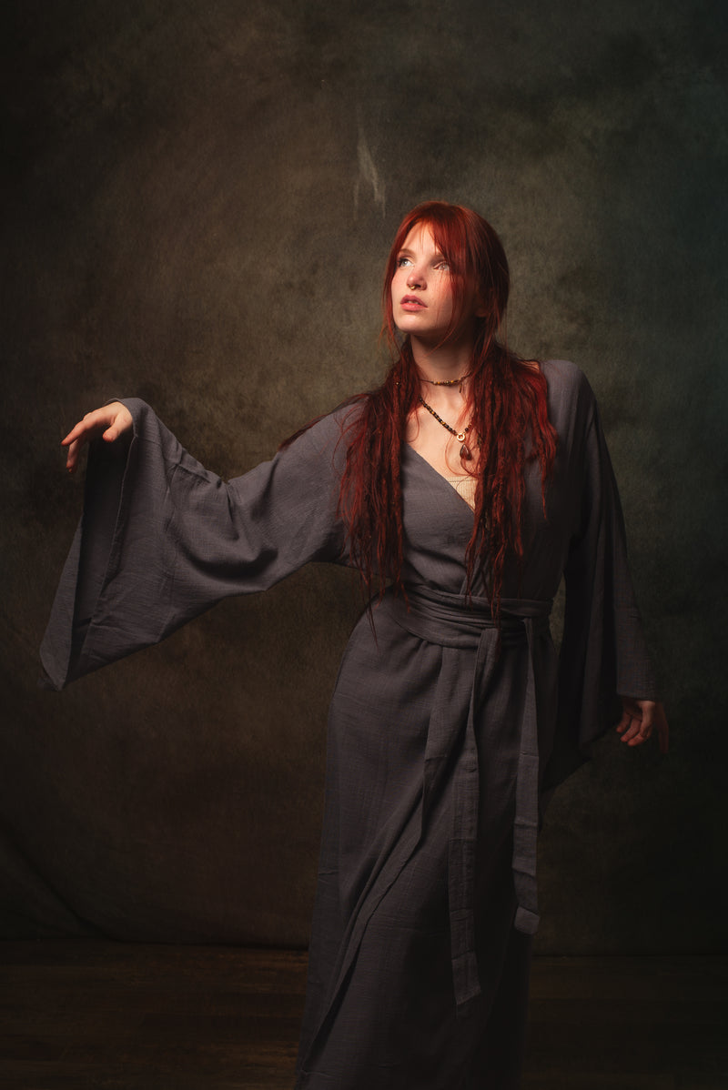 MIRA Womens Kimono Dress Grey Brown Japanese Arm Flairs Soft Breathable Cotton Festival Ritual Resort Wear AJJAYA