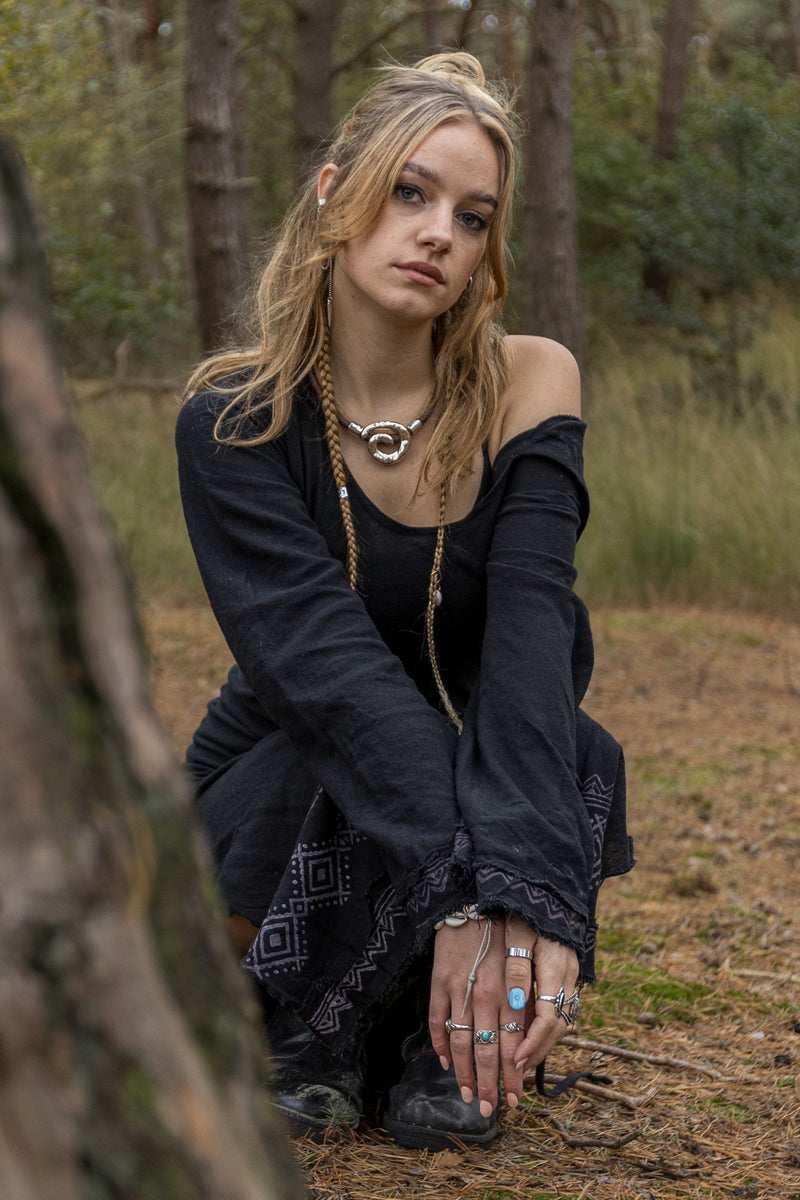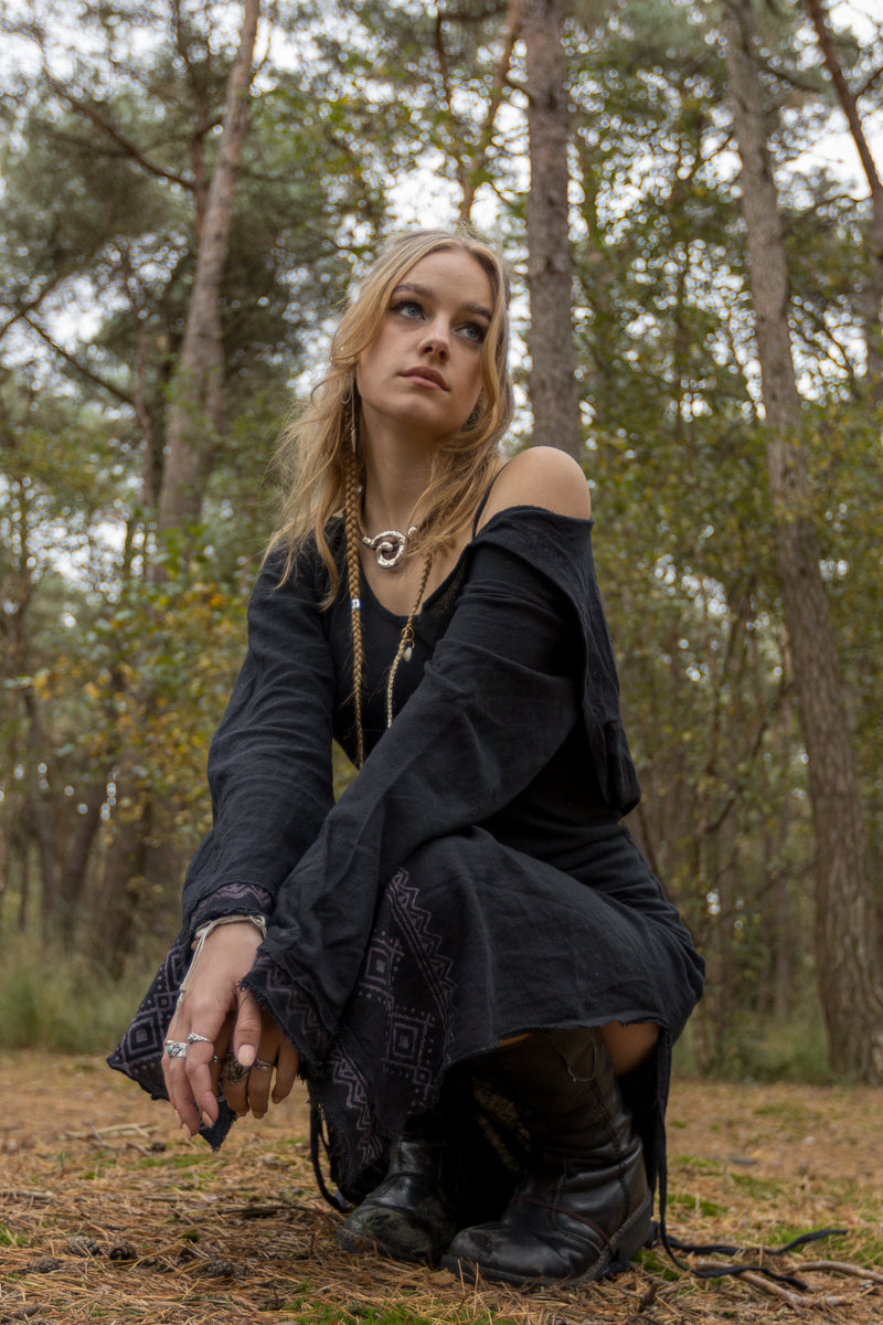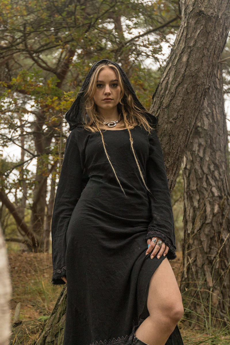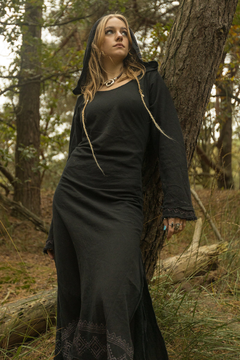 Our MISTIK Ankle Long Dress has long sleeves and an oversized hood . . .