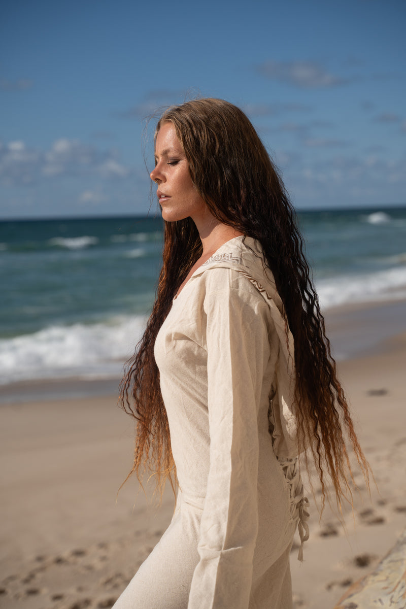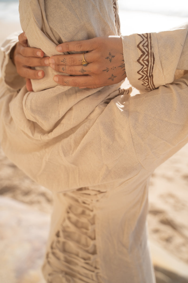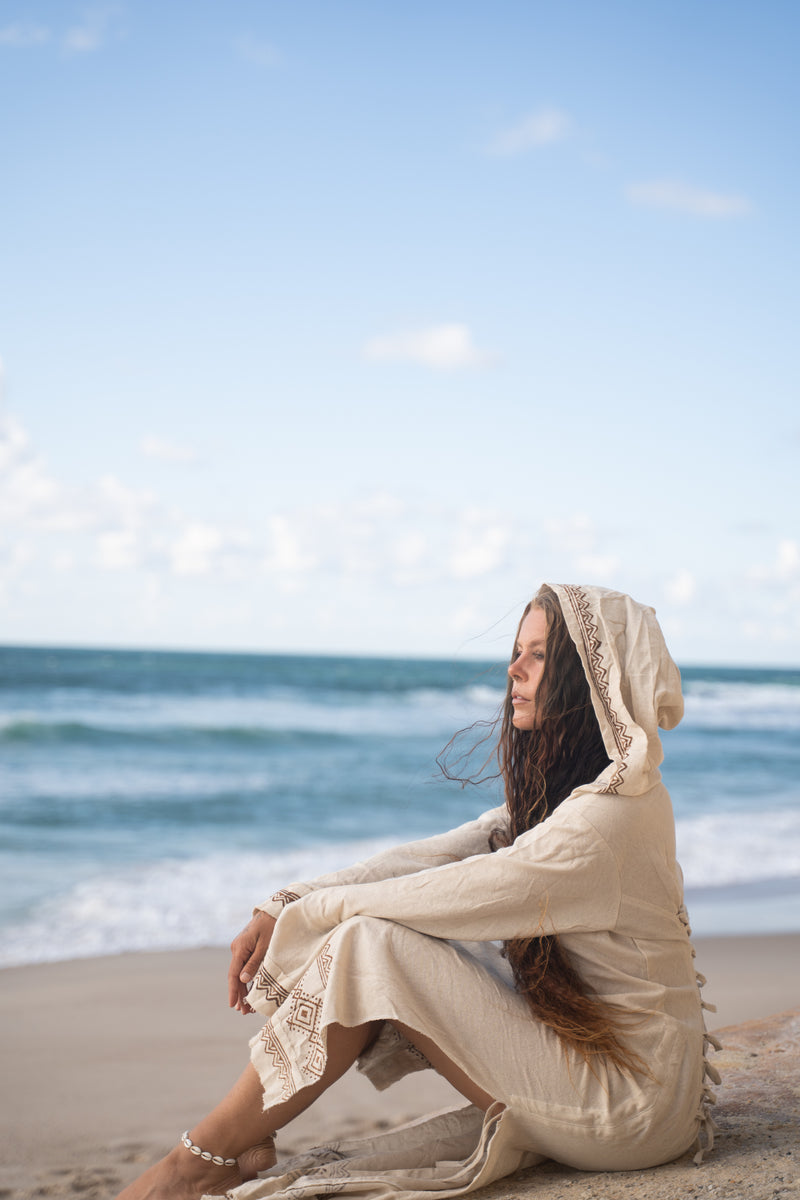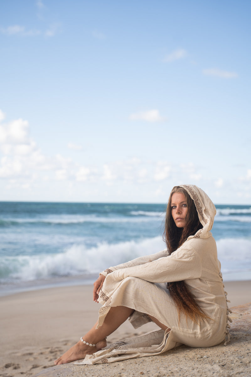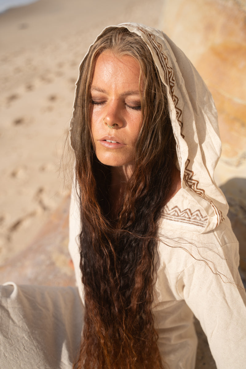 MISTIK Evening Dress Beige Long Sleeve Hooded Ankle Length Natural Dyed Cotton Block Printed Pattern Fairy Gypsy Boho Festival AJJAYA
