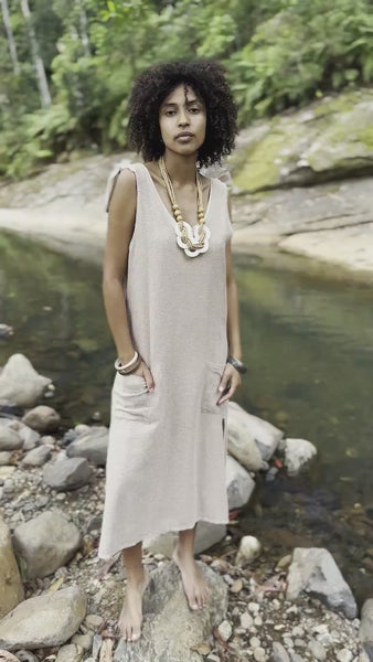 Our SAANUK bohemian dress is a stunning piece that perfectly embodies the laid-back, carefree spirit of bohemian fashion. The dress features a simplistic peasant style, with a free-flowing silhouette that is both comfortable and chic. The double-layer fabric is made up of a soft cotton interior and a netted cotton exterior, providing both comfort and texture. The dress also has two pockets, which are great for carrying your essentials while on the go. Additionally, the slashed under-thigh opening adds a touch of edginess and interest to the overall look of the dress. Whether you're headed to a music festival or just looking for a casual, comfortable dress to wear on a summer day, this piece is sure to become a favourite in your wardrobe.