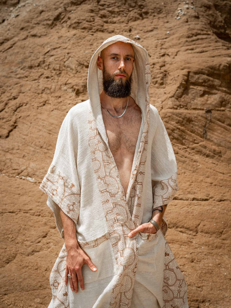 WIZARD 男式连帽和服背心米色部落图案炼金术士巫师仪式仪式吉普赛节魔法炼金术原始伊卡罗阿贾亚