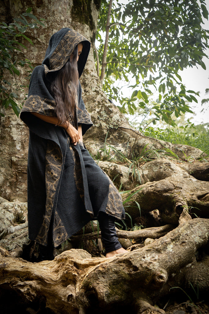 黑色 ANAGAMI 女式连帽和服斗篷披风长袍块印花天然染色仪式仪式萨满部落炼金术神圣披肩包裹 Rave AJJAYA