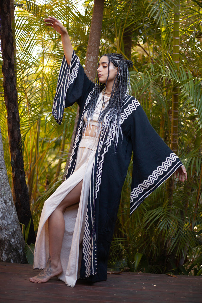 BUNTU 黑色和服长袍手工部落非洲图案天然纹理棉萨满仪式仪式节日波西米亚吉普赛 AJJAYA