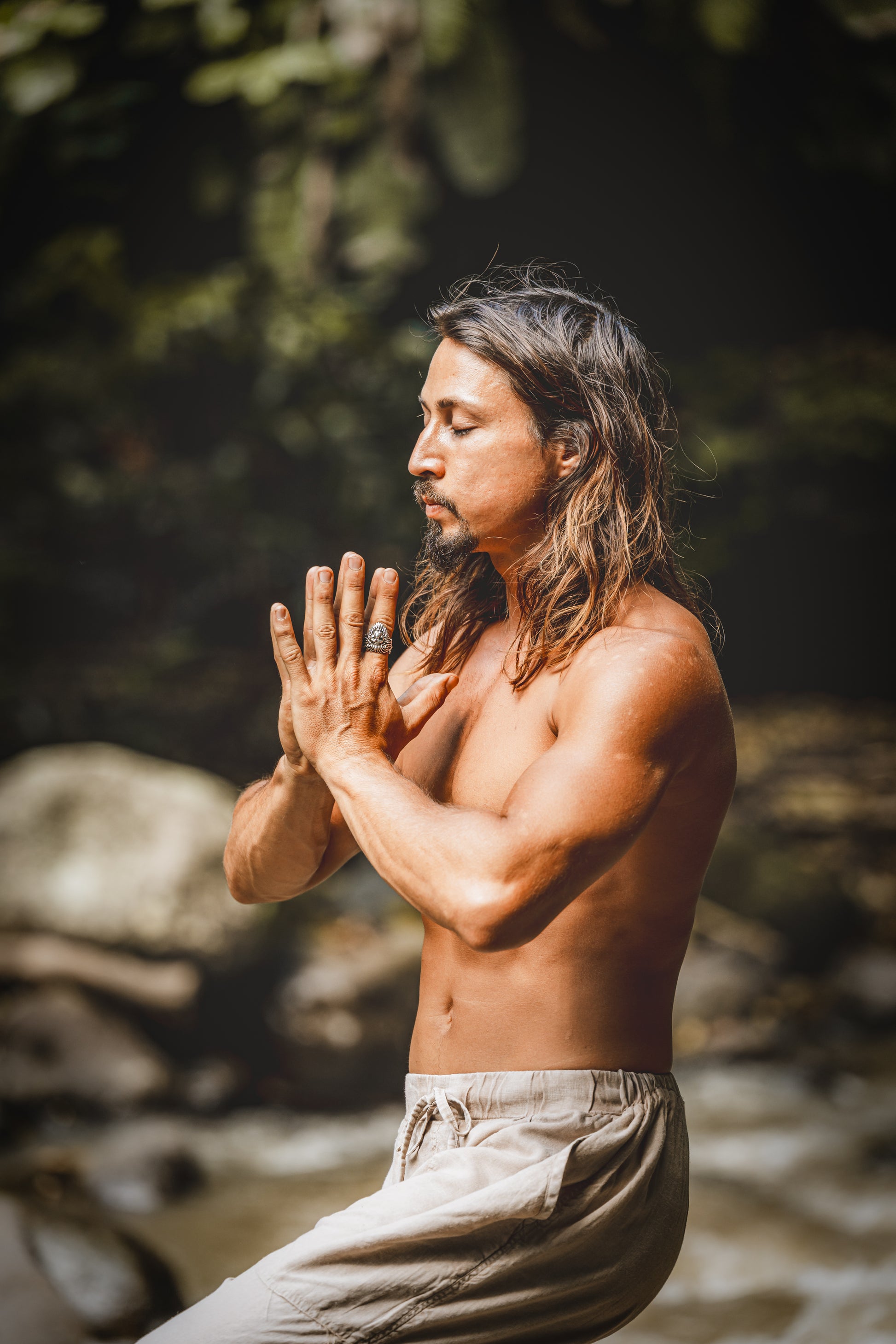 YUGI 米色男士纯棉后宫瑜伽裤天然植物染色口袋瑜伽士透气健身房直筒裤弹性抽绳 Festival Rave AJJAYA