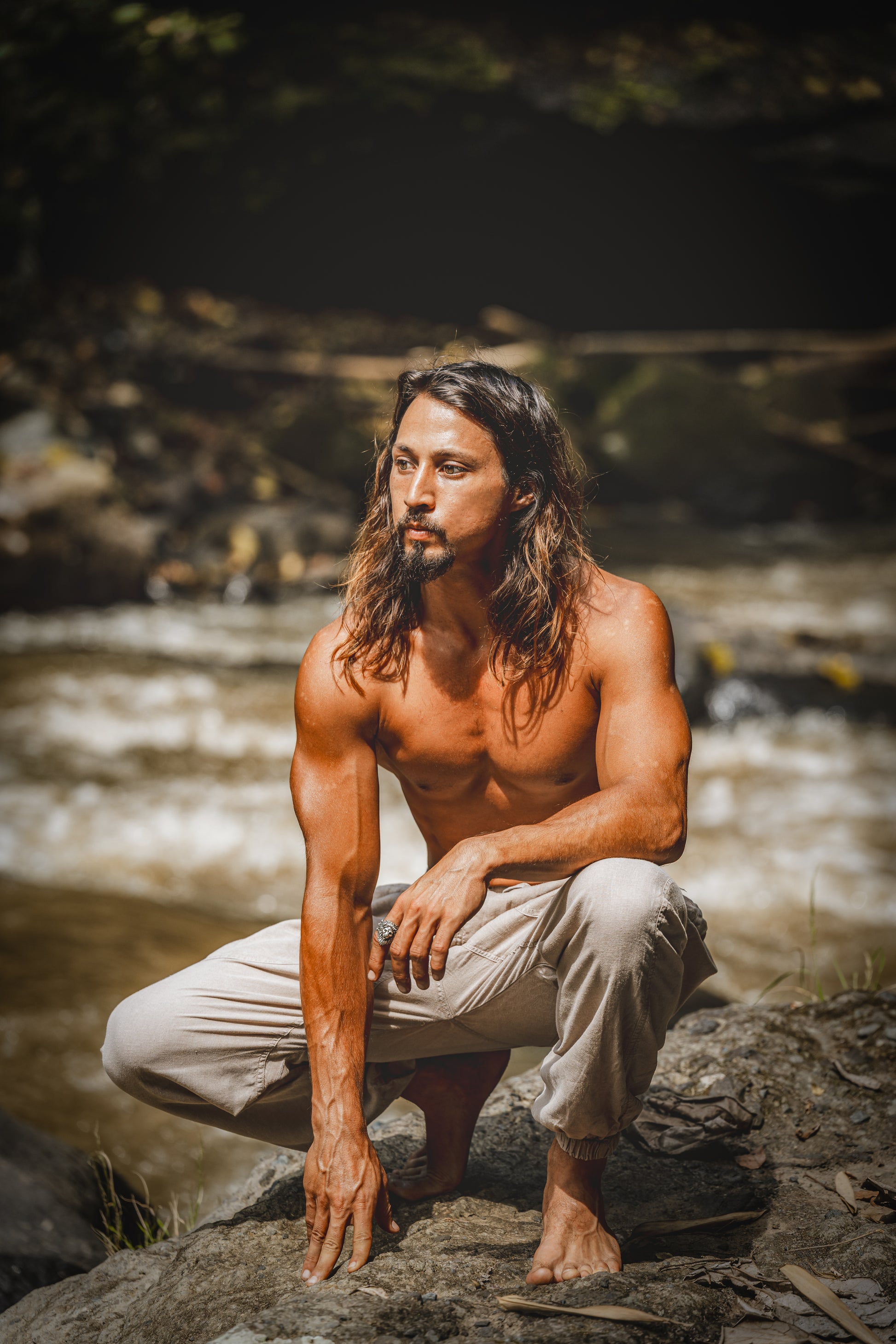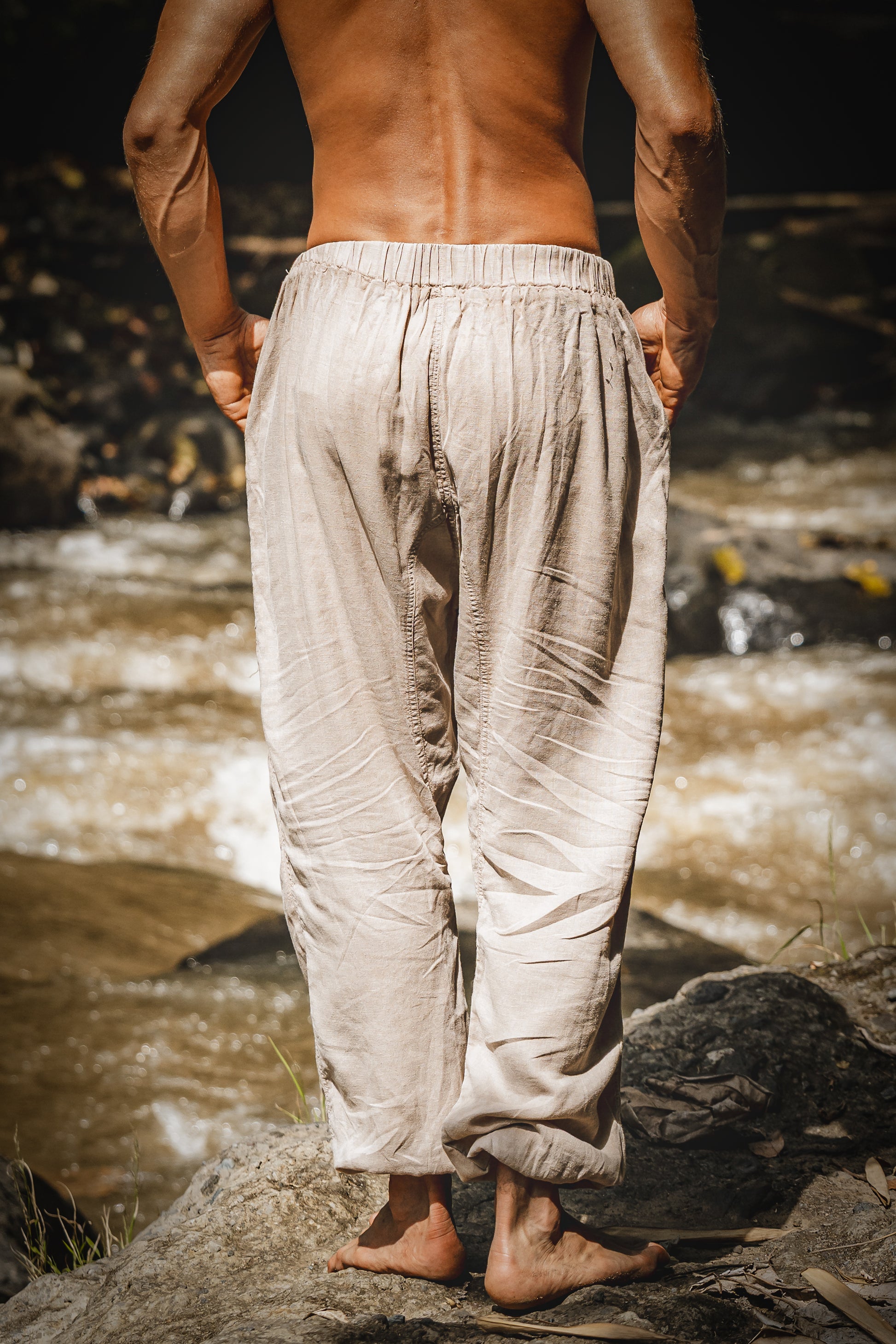 • YUGI 米色男士纯棉后宫瑜伽裤天然植物染色口袋瑜伽士透气健身房直筒裤弹性抽绳 Festival Rave AJJAYA